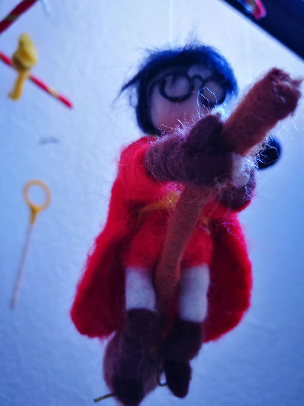 Lana afieltrada con aguja, abalorios, madera, lazo y alambre